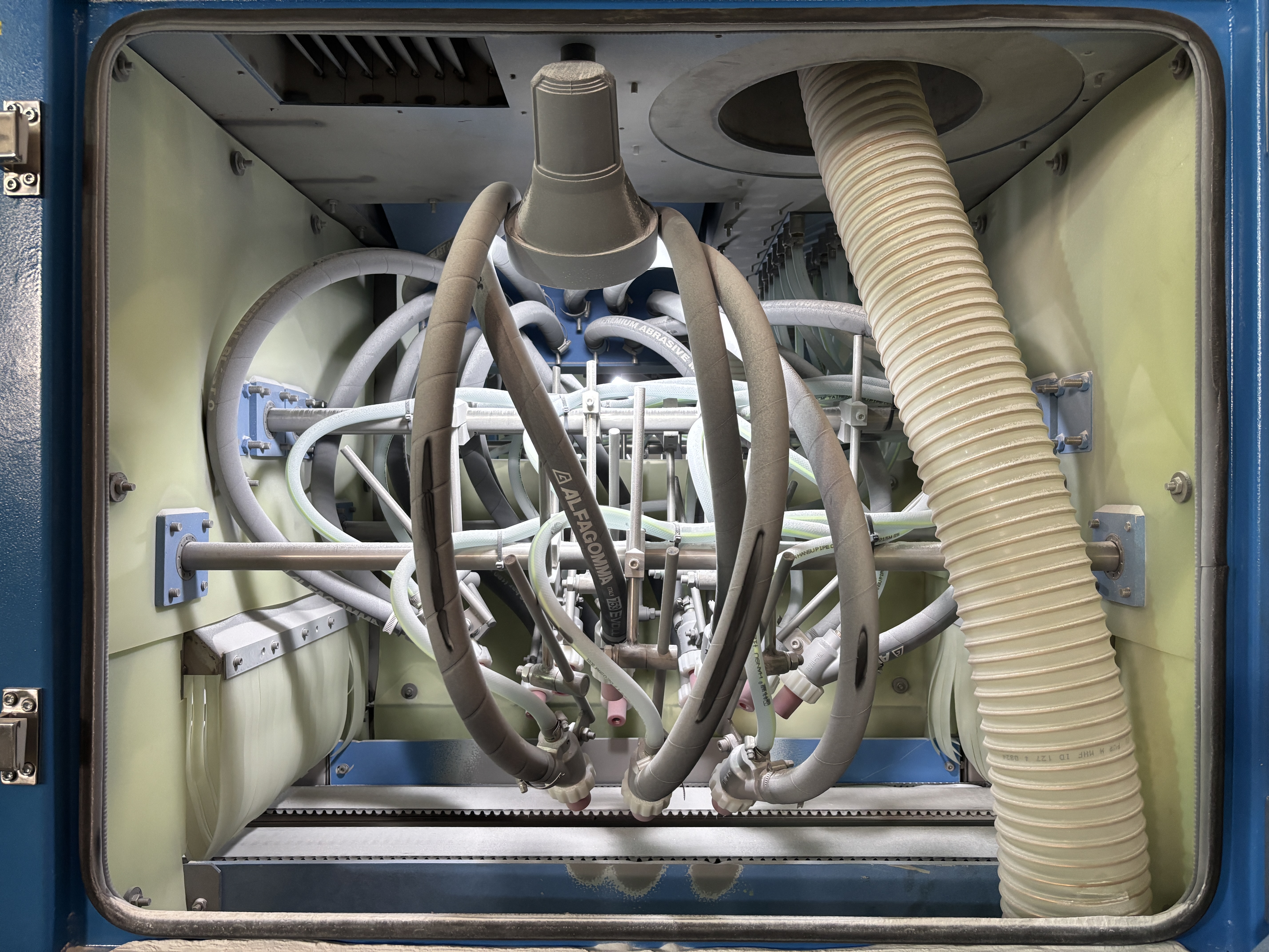 配备多支V型碳化硼喷嘴普压枪,每个流道均匀分布,摇摆型喷砂,实现全方位、高效率的喷砂效果。